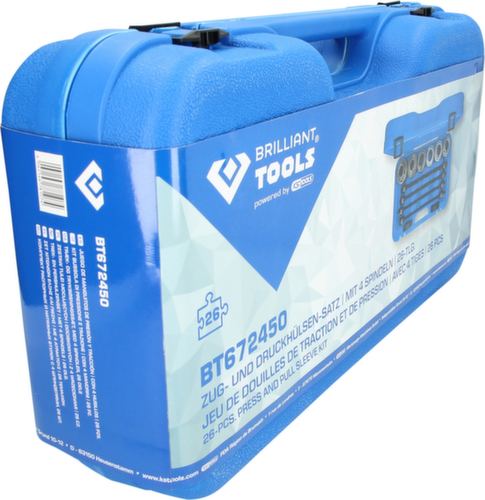 "longDescription": "<ul><li class=\"liste\">26-teiliger Satz</li><li class=\"liste\">umfangreicher Satz für schnelle und effektive Demontage und Montage von Radlagern und Fahrwerksbuchsen</li><li class=\"liste\">reduziert die Gefahr von Beschädigungen am Lager und Gehäuse</li><li class=\"liste\">Verwendung von Druckplatten und Hülsen auch mit Werkstattpressen möglich</li></ul><br />Der BRILLIANT TOOLS Zug- und Druckhülsen-Satz BT672450 ist für die schnelle und effektive Demontage und Montage von Radlagern und Fahrwerksbuchsen hervorragend geeignet. Er reduziert die Gefahr von Beschädigungen am Lager und an Gehäusen. Alle Druckplatten und Hülsen sind zur Verwendung an einer Werkstattpresse geeignet.<br /><br /><strong>Lieferumfang:</strong><br /><br />Druckplatten mit 4 Abstufungen<br />Druckplatten Ø 83 x 20 mm<br />4 x Druckspindeln: M10 x 1,5 - M12 x 1,75 - M14 x 2,0 - M16 x 2,0 mm, Länge 45 cm<br />Druckhülsen-Außen-Ø: 44, 46, 48, 50, 52, 54, 56, 58, 60, 62, 64, 66, 68, 70, 72, 74, 76, 78, 80, 82 mm<br />Hülsen-Wandstärke 5 mm<br />Hülsenhöhe 94 mm<br /><br />UNSERE QUALITÄT: BRILLIANT<br />UNSERE PREISE: SMART<br /><br />In jedem Werkzeug steckt mehr als ein viertel Jahrhundert Erfahrungen unserer Experten. Diese kompromisslose Qualität, Profi-Werkzeuge mit höchster Qualität für den harten Arbeitsalltag, ist eines der Erfolgsrezepte für uns. Wir verzichten auf eine große Vertriebsstruktur und extravagante Marketing-Aktivitäten und können Dir die Produkte daher zu einem sensationell günstigen Preis-/Leistungsverhältnis anbieten. Spare bares Geld ohne Deine Qualitätsansprüche herunterzuschrauben!<br /><br />Ein Qualitätswerkzeug powered by KS TOOLS.<br /><br>",
