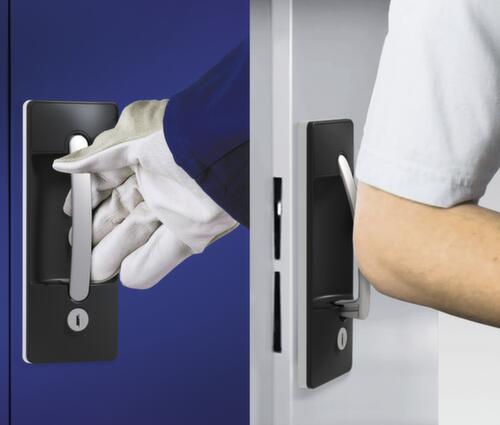 "value": "<h2>Erleichterte Bedienbarkeit, hochwertige Optik und Verschleißfestigkeit</h2><p>Das Griffschloss Ergo-Lock wurde für Ihren <strong>reibungslosen Arbeitsalltag</strong> konzipiert. Durch den großzügigen, ergonomischen Griffbügel lässt sich der Schrank auch mit Handschuhen <strong>ganz einfach öffnen</strong>. Auch mit nun vollen oder schmutzigen Händen bleibt das Schließen der Flügeltür durch den zum Patent angemeldeten Mechanismus <strong>„Zum Schließen einfach zudrücken“</strong> eine saubere Sache. Für einen <strong>kontrollierten Zugriff</strong> auf den Inhalt ist das Ergo-Lock standardmäßig mit einem Sicherheitszylinderschloss ausgestattet. Dieses schützt ihr Werkzeug oder anderes Arbeitsmaterial mit einem 3-riegeliegen Schließsystem vor unbefugter Entnahme und wird inklusive 2 Schlüsseln geliefert. Der robuste schwarze Rahmen verleiht Ihrem Schrank zudem eine <strong>hochwertige Optik</strong></p>\n "