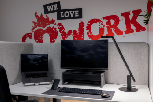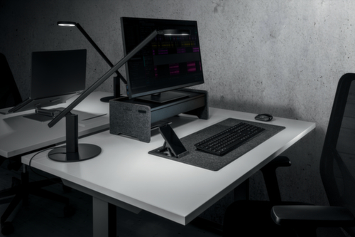 Ausgestattet mit integriertem Kabelmanagement. 3-Fach ergonomisch höhenverstellbar. Aus zu 60 % recyceltem PET-Filz in anthrazit.