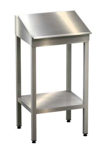 "longDescription": "<h2>Stehpult</h2><strong>für hygienesensible Bereiche</strong><br><ul><li><strong>Solide und besonders stabil</strong> durch komplett verschweißte Konstruktion</li><li><strong>Rostfrei und korrosionsbeständig</strong> - aus Edelstahl 1.4301</li><li><strong>Unempfindlich gegen Verschmutzung oder Kratzer</strong> durch matt geschliffene Oberfläche</li><li><strong>Viel Ablagefläche</strong> - mit schräg gestellter Schreibablage mit Stiftablage</li></ul><br><strong>Sie haben die Wahl:</strong><br><ul><li><strong>Stationär oder fahrbar</strong> - wahlweise mit 4 Lenkrollen, 2 davon mit Feststeller</li><li><strong>Schnell griffbereit oder geschützt</strong> - mit Fachboden oder Schrank mit Flügeltür, wahlweise abschließbar</li></ul>",