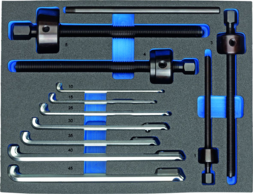 "longDescription": "Kugellagerabzieher-Satz für über 40 Kugellager, Zum Abziehen von Kugellagern, die auf einer Welle und zugleich in einem Gehäuse sitzen, Zerstörungsfreies Abziehen von Rillenkugellagern ohne Ausbau der Welle, kein Aufbohren des Lagerkäfigs notwendig (spänefrei), Mit Check-Tool-Einlage für das schnelle Erkennen von fehlendem Werkzeug, Einlage in Schubladen mit den Mindestmaßen 340 x 260 x 60 mm verwendbar<br>",