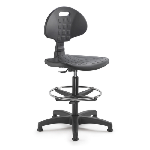 "longDescription": "<h2>Hoher Drehstuhl</h2><p>Dieser hohe Werkstattstuhl mit Rückenlehne wird für Werkstätten, Labors oder Geschäfte empfohlen. Die Sitzfläche aus Polyurethanschaum ist widerstandsfähig gegen Stöße, Schnitte, Verbrennungen, säurehaltige Öle und Laugen. Dank des Materials ist er sehr leicht abwaschbar und eignet sich ideal bei Nutzung in schnell schmutzenden Bereichen. Sie haben die Möglichkeit die Sitzhöhe des Drehstuhls von 55 cm bis zu 80 cm zu verstellen. Je nach Belieben, ob Sie den Arbeitsstuhl als praktischen Drehstuhl nutzen möchten oder Bewegung in Ihren Körper bringen und ihn als Stehhilfe nutzen, der Arbeitsdrehstuhl ermöglicht Ihnen auch das Ablegen und Stützen Ihrer Füße mit einer ebenfalls höhenverstellbaren Fußablage. Ein Komfort, der bei einem Standard-Drehhocker nicht vorhanden ist. Des Weiteren können Sie je nach Bedarf und Belastung sich auch einfach zurücklehnen. Die kippbare Rückenlehne erlaubt flexible Bewegungen auf dem Arbeitsdrehstuhl. Der Sitz und die Rückenlehne mit Dauerkontakt passen sich den Bewegungen des Rückens an und sorgen so für mehr Annehmlichkeit. Alle Details: - Kippbare Rückenlehne - Höhenverstellung von 55 bis 80 cm mittels Gasdruckfeder. - Sitzfläche: B 47 x T 43 cm - Rückenteil: B 41 x H 31 cm - Höhenverstellbare Fußablage: Durchmesser 44 cm - Material Sitzfläche und Rückenteil: Polyurethan - Sitz in Sitzposition arretiert, leichtes Verschieben, sobald er nicht beladen ist - Rückenteil mit integriertem Griff - Fußstütze Ø 46 cm, höhenverstellbar von 19 bis 43 cm - Fünfarmiges Fußkreuz aus schwarzem Nylon Sichere Arbeit im gesunden, angenehmen Umfeld ist der beste Garant für Unternehmenserfolg. So schaffen Sie ein zufriedenes Arbeitsumfeld: Erkunden Sie einfach unsere Produkte zur ergonomischen Arbeitsplatzgestaltung .</p><br>",