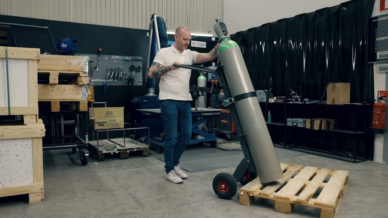 "description": "Tragl. 80kg, 1x40/50l Flasche, Zurrgurt, RAL7043, Luft-Bereifung",