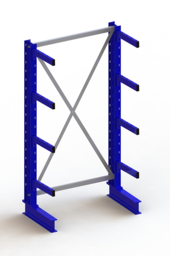 Die wichtigsten Maße des META Kragarmregals Multistrong medium auf einen Blick:Nutzung einseitig - zur Aufstellung an der Wand konzipiert. 5 Lagerebenen. Traglast je Arm 535 kg. Fachhöhen je nach Einsatzzweck und Ihrem Bedarf im Raster von 100 mm verstellbar. Nutztiefe 400 mm. Konstruktion aus Stahl. Ständer in RAL5010 Enzianblau. Kragarme in RAL5010 Enzianblau.