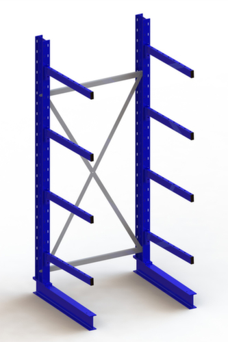 Die wichtigsten Maße des META Kragarmregals Multistrong medium auf einen Blick:Nutzung einseitig - zur Aufstellung an der Wand konzipiert. 5 Lagerebenen. Traglast je Arm 250 kg. Fachhöhen je nach Einsatzzweck und Ihrem Bedarf im Raster von 100 mm verstellbar. Nutztiefe 800 mm. Konstruktion aus Stahl. Ständer in RAL5010 Enzianblau. Kragarme in RAL5010 Enzianblau.