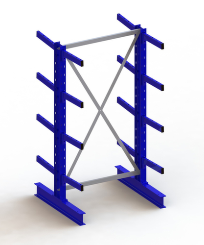 Die wichtigsten Maße des META Kragarmregals Multistrong medium auf einen Blick:Nutzung beidseitig - flexible Aufstellung frei im Raum möglich. 5 Lagerebenen. Traglast je Arm 535 kg. Fachhöhen je nach Einsatzzweck und Ihrem Bedarf im Raster von 100 mm verstellbar. Nutztiefe 400 mm. Konstruktion aus Stahl. Ständer in RAL5010 Enzianblau. Kragarme in RAL5010 Enzianblau.