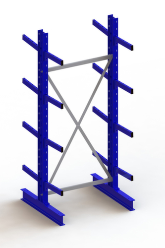 Die wichtigsten Maße des META Kragarmregals Multistrong medium auf einen Blick:Nutzung beidseitig - flexible Aufstellung frei im Raum möglich. 5 Lagerebenen. Traglast je Arm 535 kg. Fachhöhen je nach Einsatzzweck und Ihrem Bedarf im Raster von 100 mm verstellbar. Nutztiefe 400 mm. Konstruktion aus Stahl. Ständer in RAL5010 Enzianblau. Kragarme in RAL5010 Enzianblau.
