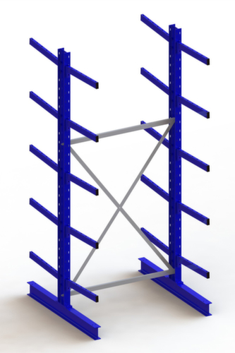 Die wichtigsten Maße des META Kragarmregals Multistrong medium auf einen Blick:Nutzung beidseitig - flexible Aufstellung frei im Raum möglich. 6 Lagerebenen. Traglast je Arm 355 kg. Fachhöhen je nach Einsatzzweck und Ihrem Bedarf im Raster von 100 mm verstellbar. Nutztiefe 600 mm. Konstruktion aus Stahl. Ständer in RAL5010 Enzianblau. Kragarme in RAL5010 Enzianblau.