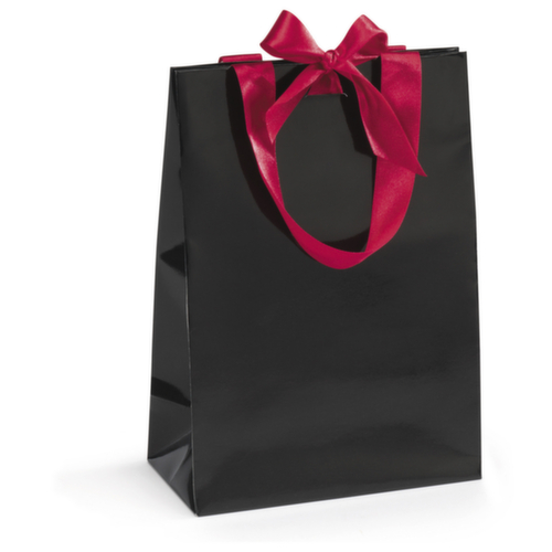 "metaTitle": "Lackpapier-Tragetaschen mit Satinschleife 190 x 100 x 270 mm schwarz - Taschen & Tüten",