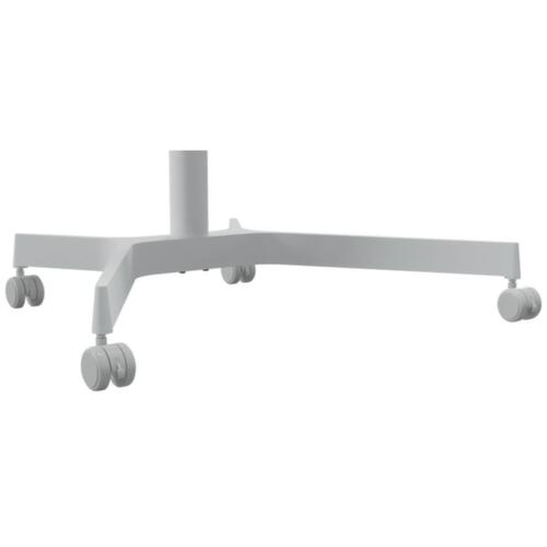 Platte aus Spanplatte mit pflegeleichter Melaminharzbeschichtung in Dekor weiß. Plattenform rechteckig. Kante mit stoßfestem ABS-Umleimer. Gestell aus Aluminium mit schlag- und kratzfester Pulverbeschichtung in weiß. Höhenverstellung durch pneumatische Unterstützung mittels Hebel. Dadurch ist die Höhenverstellung stufenlos. Gestell mit 4 Lenkrollen, durch die ein einfaches Manövrieren ermöglicht wird.