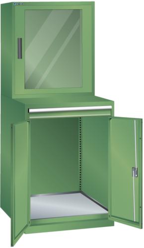 "longDescription": "LISTA Computerschrank, Lista Einheit: 36x36E, BxTxH: 717x725x1700mm, Arbeitshöhe: 1000mm, Ausführung/Typ: ohne Steckerleiste, Ausstattung: 1 Monitorfach (BxTxH 600x317x618mm, Grösse Sichtfenster BxH: 476x496mm) mit Einschwenktür, jeweils mit Zylinderschloss, 1 Verstellboden glatt im Monitorfach, 1 arretierbare 75 mm Keyboard-Schublade mit Vollauszug, 1 Hardwareschrank mit Flügeltüren inklusive Schliessung, Geräteauszug, Verstellboden glatt, 1 eingebauter Ventilator, 1 Anschlusskabel, 5 m lang, 1 Öffnung in Rückwand mit abnehmbarer Abdeckung, Schliessart: Key Lock, Standard-Schliessung mit Wechselzylinder inkl. 2 Schlüsseln mit Schlüsselnummer, Farbe Gehäuse: Resedagrün RAL 6011, Farbe Türen: Resedagrün RAL 6011. Computer und die dazugehörige Hard- und Software müssen in der Produktion vor Staub, Schmutz und unerlaubtem Zugriff geschützt werden. Mit dem LISTA Computerschrank steht eine sichere und bewährte Lösung zur Verfügung<br>",
