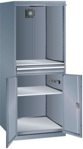 "longDescription": "LISTA Computerschrank, Lista Einheit: 36x36E, BxTxH: 717x725x1625mm, Arbeitshöhe: 880mm, Ausführung/Typ: F, Ausstattung: 1 Monitorfach (BxTxH 650x620x605mm, Grösse Sichtfenster BxH: 445x525mm) mit Einschwenktür, jeweils mit Zylinderschloss, 1 Verstellboden glatt im Monitorfach, 1 arretierbare 75 mm Keyboard-Schublade mit Vollauszug, 1 Hardwareschrank mit Flügeltüren inklusive Schliessung, fest eingebauter Stromversorgung, bestehend aus einer 4-fach Steckerleiste (230 V) mit beleuchtetem Schalter, Geräteauszug, Verstellboden glatt, 1 eingebauter Ventilator, 1 Anschlusskabel, 5 m lang, 1 Öffnung in Rückwand mit abnehmbarer Abdeckung, Schliessart: Key Lock, Standard-Schliessung mit Wechselzylinder inkl. 2 Schlüsseln mit Schlüsselnummer, Farbe Gehäuse: Grau metallic NCS S 6502-B, Farbe Türen: Grau metallic NCS S 6502-B. Computer und die dazugehörige Hard- und Software müssen in der Produktion vor Staub, Schmutz und unerlaubtem Zugriff geschützt werden. Mit dem LISTA Computerschrank steht eine sichere und bewährte Lösung zur Verfügung<br>",