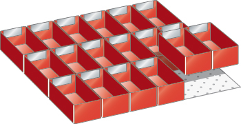 "longDescription": "LISTA Einteilungsmaterial-Set, Ausführung: Einsatzkästen, Lista Einheit: 27x27E, Schubladennutzfläche BxT: 459x459mm, Für Fronthöhe: 100mm, Ausstattung: 18 Einsatzkästen 150x75mm, Ausführung: Polystyrol-Kunststoff, Farbe: rot. Volle Kombinierbarkeit mit dem kompletten LISTA-Sortiment durch einheitliches Masssystem. Schnelle und einfache Montage dank umlaufendem Schubladenschlitzraster und gelochter Schubladenböden<br>",