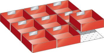 "longDescription": "LISTA Einteilungsmaterial-Set, Ausführung: Einsatzkästen, Lista Einheit: 27x27E, Schubladennutzfläche BxT: 459x459mm, Für Fronthöhe: 75mm, Ausstattung: 9 Einsatzkästen 150x150mm, Ausführung: Polystyrol-Kunststoff, Farbe: rot. Volle Kombinierbarkeit mit dem kompletten LISTA-Sortiment durch einheitliches Masssystem. Schnelle und einfache Montage dank umlaufendem Schubladenschlitzraster und gelochter Schubladenböden<br>",