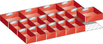 "longDescription": "LISTA Einteilungsmaterial-Set, Ausführung: Einsatzkästen, Lista Einheit: 36x27E, 27x36E, Schubladennutzfläche BxT: 612x459mm, Für Fronthöhe: 75mm, Ausstattung: 12 Einsatzkästen 150x75mm, 6 Einsatzkästen 150x150mm, Ausführung: Polystyrol-Kunststoff, Farbe: rot. Volle Kombinierbarkeit mit dem kompletten LISTA-Sortiment durch einheitliches Masssystem. Schnelle und einfache Montage dank umlaufendem Schubladenschlitzraster und gelochter Schubladenböden<br>",