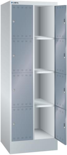 "longDescription": "LISTA Fächerschrank, BxTxH: 610x500x1795mm, Anzahl Abteile: 2x4, Fachmass: BxH 300x400mm, Ausstattung: mit Sockel 150mm hoch, Schliessart: Zylinderschloss, Farbe Gehäuse: Lichtgrau RAL 7035, Farbe Türen: Grau metallic NCS S 6502-B. Höchste Stabilität durch allseitig gerollte, rechts angeschlagene Flügeltüren mit gewölbter Oberfläche. Durchdachte Belüftung durch oberes und unteres Lochfeld der Tür. Übersichtliche Beschriftung dank eingeprägtem Etikettenrahmen. Schutz vor Verschmutzung durch Unterbau mit Sockel gegen Verschmutzungen unter dem Schrank<br>",