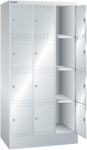 "longDescription": "LISTA Fächerschrank, BxTxH: 905x500x1795mm, Anzahl Abteile: 3x4, Fachmass: BxH 300x400mm, Ausstattung: mit Sockel 150mm hoch, Schliessart: Zylinderschloss, Farbe Gehäuse: Lichtgrau RAL 7035, Farbe Türen: Lichtgrau RAL 7035. Höchste Stabilität durch allseitig gerollte, rechts angeschlagene Flügeltüren mit gewölbter Oberfläche. Durchdachte Belüftung durch oberes und unteres Lochfeld der Tür. Übersichtliche Beschriftung dank eingeprägtem Etikettenrahmen. Schutz vor Verschmutzung durch Unterbau mit Sockel gegen Verschmutzungen unter dem Schrank<br>",