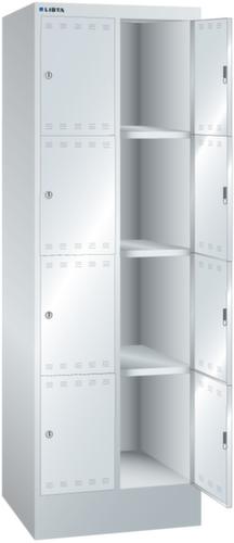 "longDescription": "LISTA Fächerschrank, BxTxH: 610x500x1795mm, Anzahl Abteile: 2x4, Fachmass: BxH 300x400mm, Ausstattung: mit Sockel 150mm hoch, Schliessart: Verschlussvorrichtung, Farbe Gehäuse: Lichtgrau RAL 7035, Farbe Türen: Reinweiss RAL 9010. Höchste Stabilität durch allseitig gerollte, rechts angeschlagene Flügeltüren mit gewölbter Oberfläche. Durchdachte Belüftung durch oberes und unteres Lochfeld der Tür. Übersichtliche Beschriftung dank eingeprägtem Etikettenrahmen. Schutz vor Verschmutzung durch Unterbau mit Sockel gegen Verschmutzungen unter dem Schrank<br>",