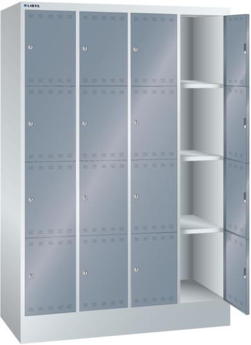 "longDescription": "LISTA Fächerschrank, BxTxH: 1200x500x1795mm, Anzahl Abteile: 4x4, Fachmass: BxH 300x400mm, Ausstattung: mit Sockel 150mm hoch, Schliessart: Verschlussvorrichtung, Farbe Gehäuse: Lichtgrau RAL 7035, Farbe Türen: Grau metallic NCS S 6502-B. Höchste Stabilität durch allseitig gerollte, rechts angeschlagene Flügeltüren mit gewölbter Oberfläche. Durchdachte Belüftung durch oberes und unteres Lochfeld der Tür. Übersichtliche Beschriftung dank eingeprägtem Etikettenrahmen. Schutz vor Verschmutzung durch Unterbau mit Sockel gegen Verschmutzungen unter dem Schrank<br>",