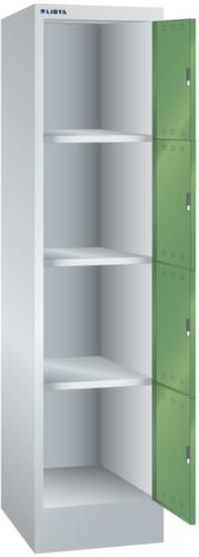 "longDescription": "LISTA Fächerschrank, BxTxH: 415x500x1795mm, Anzahl Abteile: 1x4, Fachmass: BxH 400x400mm, Ausstattung: mit Sockel 150mm hoch, Schliessart: Verschlussvorrichtung, Farbe Gehäuse: Lichtgrau RAL 7035, Farbe Türen: Resedagrün RAL 6011. Höchste Stabilität durch allseitig gerollte, rechts angeschlagene Flügeltüren mit gewölbter Oberfläche. Durchdachte Belüftung durch oberes und unteres Lochfeld der Tür. Übersichtliche Beschriftung dank eingeprägtem Etikettenrahmen. Schutz vor Verschmutzung durch Unterbau mit Sockel gegen Verschmutzungen unter dem Schrank<br>",