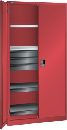 "longDescription": "LISTA Flügeltürschrank, BxTxH: 1000x580x1950mm, Anzahl Verstellböden: 2 (60kg), 30mm stark, verzinkt, Anzahl Schubladen: 3x95mm (50kg), Anzahl Auszugböden: 2 (50kg), Schliessart: Code Lock, elektronisches Zahlenschloss mit 10 Ziffern für 4- bis 6-stellige Codes, bis 100 Codes, Türlagerung: Vollblech-Flügeltüren mit Scharnierlagerung, Öffnungswinkel ca. 115 Grad, Farbe Gehäuse: Rubinrot RAL 3003, Farbe Türen: Rubinrot RAL 3003, Farbe Schubladen/Auszugböden: Anthrazitgrau RAL 7016. Höchste Stabilität durch eine Gehäusetragkraft bis 500 kg. Hohe Traglasten: 60 kg oder 100 kg pro Verstellboden, 50 kg pro Schublade/Auszugbogen. Exzellente Schutzeigenschaften gegen Schmutz, Flüssigkeiten und mechanische Beanspruchung durch geschlossenes Gehäuse mit schlag- und abriebfester Oberfläche. Flexible Ausstattungsmöglichkeiten mit Abdeckungen, Lochwänden, Hängemappenauszügen, Schreibpultaufsätzen und Garderobenstangen. Optimale Ordnung und Organisation durch optionalen Einbau von Schubladen und Auszugböden für eine saubere und übersichtliche Lagerung von Kleinteilen (bei Schranktiefe 580 mm). Sichere Verschliessbarkeit mit Vollblech- oder Sichtfenstertüren (einschlagend, aus einem Stück gekantet) und intelligenten Schliesssystemen. Jederzeit anpassbar an neues Lagergut durch den flexiblen Ein- und Umbau von Schubladen, Auszugböden und Verstellböden im 25-mm-Raster<br>",