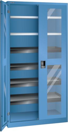 "longDescription": "LISTA Flügeltürschrank, BxTxH: 1000x580x1950mm, Anzahl Verstellböden: 2 (60kg), 30mm stark, verzinkt, Anzahl Auszugböden: 4 (50kg), Schliessart: Code Lock, elektronisches Zahlenschloss mit 10 Ziffern für 4- bis 6-stellige Codes, bis 100 Codes, Türlagerung: Sichtfenster-Flügeltüren mit Scharnierlagerung, Öffnungswinkel ca. 115 Grad, Farbe Gehäuse: Capriblau RAL 5019, Farbe Türen: Capriblau RAL 5019, Farbe Auszugböden: Anthrazitgrau RAL 7016. Höchste Stabilität durch eine Gehäusetragkraft bis 500 kg. Hohe Traglasten: 60 kg oder 100 kg pro Verstellboden, 50 kg pro Schublade/Auszugbogen. Exzellente Schutzeigenschaften gegen Schmutz, Flüssigkeiten und mechanische Beanspruchung durch geschlossenes Gehäuse mit schlag- und abriebfester Oberfläche. Flexible Ausstattungsmöglichkeiten mit Abdeckungen, Lochwänden, Hängemappenauszügen, Schreibpultaufsätzen und Garderobenstangen. Optimale Ordnung und Organisation durch optionalen Einbau von Schubladen und Auszugböden für eine saubere und übersichtliche Lagerung von Kleinteilen (bei Schranktiefe 580 mm). Sichere Verschliessbarkeit mit Vollblech- oder Sichtfenstertüren (einschlagend, aus einem Stück gekantet) und intelligenten Schliesssystemen. Jederzeit anpassbar an neues Lagergut durch den flexiblen Ein- und Umbau von Schubladen, Auszugböden und Verstellböden im 25-mm-Raster<br>",