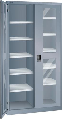 "longDescription": "LISTA Flügeltürschrank, BxTxH: 1000x500x1950mm, Anzahl Verstellböden: 10 (60kg), 30mm stark, verzinkt, Schliessart: Key Lock, Standard-Schliessung mit Wechselzylinder inkl. 2 Schlüsseln mit Schlüsselnummer, Türlagerung: Sichtfenster-Flügeltüren mit Drehbolzenlagerung, Öffnungswinkel ca. 115 Grad, Ausstattung: mit fester Trennwand, Farbe Gehäuse: Grau metallic NCS S 6502-B, Farbe Türen: Grau metallic NCS S 6502-B. Höchste Stabilität durch eine Gehäusetragkraft bis 500 kg. Hohe Traglasten: 60 kg oder 100 kg pro Verstellboden, 50 kg pro Schublade/Auszugbogen. Exzellente Schutzeigenschaften gegen Schmutz, Flüssigkeiten und mechanische Beanspruchung durch geschlossenes Gehäuse mit schlag- und abriebfester Oberfläche. Flexible Ausstattungsmöglichkeiten mit Abdeckungen, Lochwänden, Hängemappenauszügen, Schreibpultaufsätzen und Garderobenstangen. Optimale Ordnung und Organisation durch optionalen Einbau von Schubladen und Auszugböden für eine saubere und übersichtliche Lagerung von Kleinteilen (bei Schranktiefe 580 mm). Sichere Verschliessbarkeit mit Vollblech- oder Sichtfenstertüren (einschlagend, aus einem Stück gekantet) und intelligenten Schliesssystemen. Jederzeit anpassbar an neues Lagergut durch den flexiblen Ein- und Umbau von Schubladen, Auszugböden und Verstellböden im 25-mm-Raster<br>",