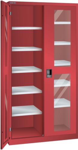 "longDescription": "LISTA Flügeltürschrank, BxTxH: 1000x500x1950mm, Anzahl Verstellböden: 10 (60kg), 30mm stark, verzinkt, Schliessart: Code Lock, elektronisches Zahlenschloss mit 10 Ziffern für 4- bis 6-stellige Codes, bis 100 Codes, Türlagerung: Sichtfenster-Flügeltüren mit Drehbolzenlagerung, Öffnungswinkel ca. 115 Grad, Ausstattung: mit fester Trennwand, Farbe Gehäuse: Rubinrot RAL 3003, Farbe Türen: Rubinrot RAL 3003. Höchste Stabilität durch eine Gehäusetragkraft bis 500 kg. Hohe Traglasten: 60 kg oder 100 kg pro Verstellboden, 50 kg pro Schublade/Auszugbogen. Exzellente Schutzeigenschaften gegen Schmutz, Flüssigkeiten und mechanische Beanspruchung durch geschlossenes Gehäuse mit schlag- und abriebfester Oberfläche. Flexible Ausstattungsmöglichkeiten mit Abdeckungen, Lochwänden, Hängemappenauszügen, Schreibpultaufsätzen und Garderobenstangen. Optimale Ordnung und Organisation durch optionalen Einbau von Schubladen und Auszugböden für eine saubere und übersichtliche Lagerung von Kleinteilen (bei Schranktiefe 580 mm). Sichere Verschliessbarkeit mit Vollblech- oder Sichtfenstertüren (einschlagend, aus einem Stück gekantet) und intelligenten Schliesssystemen. Jederzeit anpassbar an neues Lagergut durch den flexiblen Ein- und Umbau von Schubladen, Auszugböden und Verstellböden im 25-mm-Raster<br>",