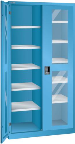 "longDescription": "LISTA Flügeltürschrank, BxTxH: 1000x580x1950mm, Anzahl Verstellböden: 10 (60kg), 30mm stark, verzinkt, Schliessart: Code Lock, elektronisches Zahlenschloss mit 10 Ziffern für 4- bis 6-stellige Codes, bis 100 Codes, Türlagerung: Sichtfenster-Flügeltüren mit Drehbolzenlagerung, Öffnungswinkel ca. 115 Grad, Ausstattung: mit fester Trennwand, Farbe Gehäuse: Lichtblau RAL 5012, Farbe Türen: Lichtblau RAL 5012. Höchste Stabilität durch eine Gehäusetragkraft bis 500 kg. Hohe Traglasten: 60 kg oder 100 kg pro Verstellboden, 50 kg pro Schublade/Auszugbogen. Exzellente Schutzeigenschaften gegen Schmutz, Flüssigkeiten und mechanische Beanspruchung durch geschlossenes Gehäuse mit schlag- und abriebfester Oberfläche. Flexible Ausstattungsmöglichkeiten mit Abdeckungen, Lochwänden, Hängemappenauszügen, Schreibpultaufsätzen und Garderobenstangen. Optimale Ordnung und Organisation durch optionalen Einbau von Schubladen und Auszugböden für eine saubere und übersichtliche Lagerung von Kleinteilen (bei Schranktiefe 580 mm). Sichere Verschliessbarkeit mit Vollblech- oder Sichtfenstertüren (einschlagend, aus einem Stück gekantet) und intelligenten Schliesssystemen. Jederzeit anpassbar an neues Lagergut durch den flexiblen Ein- und Umbau von Schubladen, Auszugböden und Verstellböden im 25-mm-Raster<br>",