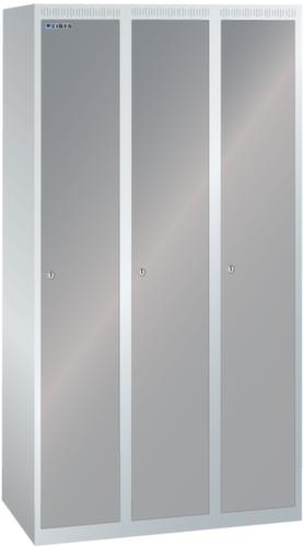"longDescription": "LISTA Garderobenschrank, BxTxH: 900x500x1700mm, Anzahl Abteile: 3, Abteilbreite: 300mm, Ausstattung: je Abteil mit 1-flügeliger Vollblech-Tür einschlagend, Oberfläche glatt (1 Abteil veschliessend), 1 Hutboden, 1 Kleiderstange mit je 3 verschiebbaren Kleiderhaken, 1 Handtuchhalter, ohne Unterbau, Schliessart: Zylinderschloss, Farbe Gehäuse: Lichtgrau RAL 7035, Farbe Türen: Taubengrau NCS S 4502-B. Höchste Stabilität durch in Drehbolzen gelagerte, rechts angeschlagene Flügeltüren mit Verstärkungstasche für mehr Einbruchsicherheit. Durchdachte Belüftung mit Belüftungsschlitzen an Gehäusedeckel und -boden. Optimale Hygiene dank glatter Abteilböden ohne Aufkantung für eine gründliche Reinigung der Abteile. Schutz vor Verschmutzung und Korrosion durch zusätzlich zur Pulverbeschichtung verzinkten Unterbau mit Sockel gegen Verschmutzungen unter dem Schrank oder Füssen für Feuchträume<br>",