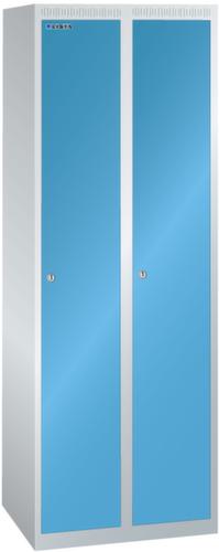 "longDescription": "LISTA Garderobenschrank, BxTxH: 600x500x1700mm, Anzahl Abteile: 2, Abteilbreite: 300mm, Ausstattung: je Abteil mit 1-flügeliger Vollblech-Tür einschlagend, Oberfläche mit Lochfeld zur zusätzlichen Belüftung (1 Abteil veschliessend), 1 Hutboden, 1 Kleiderstange mit je 3 verschiebbaren Kleiderhaken, 1 Handtuchhalter, ohne Unterbau, Schliessart: Zylinderschloss, Farbe Gehäuse: Lichtgrau RAL 7035, Farbe Türen: Lichtblau RAL 5012. Höchste Stabilität durch in Drehbolzen gelagerte, rechts angeschlagene Flügeltüren mit Verstärkungstasche für mehr Einbruchsicherheit. Durchdachte Belüftung mit Belüftungsschlitzen an Gehäusedeckel und -boden. Optimale Hygiene dank glatter Abteilböden ohne Aufkantung für eine gründliche Reinigung der Abteile. Schutz vor Verschmutzung und Korrosion durch zusätzlich zur Pulverbeschichtung verzinkten Unterbau mit Sockel gegen Verschmutzungen unter dem Schrank oder Füssen für Feuchträume<br>",