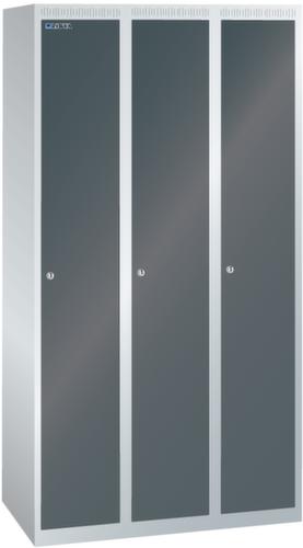 "longDescription": "LISTA Garderobenschrank, BxTxH: 900x500x1700mm, Anzahl Abteile: 3, Abteilbreite: 300mm, Ausstattung: je Abteil mit 1-flügeliger Vollblech-Tür einschlagend, Oberfläche mit Lochfeld zur zusätzlichen Belüftung (1 Abteil veschliessend), 1 Hutboden, 1 Kleiderstange mit je 3 verschiebbaren Kleiderhaken, 1 Handtuchhalter, ohne Unterbau, Schliessart: Zylinderschloss, Farbe Gehäuse: Lichtgrau RAL 7035, Farbe Türen: Schwarz NCS S 9000-N. Höchste Stabilität durch in Drehbolzen gelagerte, rechts angeschlagene Flügeltüren mit Verstärkungstasche für mehr Einbruchsicherheit. Durchdachte Belüftung mit Belüftungsschlitzen an Gehäusedeckel und -boden. Optimale Hygiene dank glatter Abteilböden ohne Aufkantung für eine gründliche Reinigung der Abteile. Schutz vor Verschmutzung und Korrosion durch zusätzlich zur Pulverbeschichtung verzinkten Unterbau mit Sockel gegen Verschmutzungen unter dem Schrank oder Füssen für Feuchträume<br>",