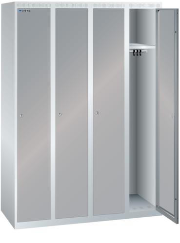 "longDescription": "LISTA Garderobenschrank, BxTxH: 1200x500x1700mm, Anzahl Abteile: 4, Abteilbreite: 300mm, Ausstattung: je Abteil mit 1-flügeliger Vollblech-Tür einschlagend, Oberfläche mit Lochfeld zur zusätzlichen Belüftung (1 Abteil veschliessend), 1 Hutboden, 1 Kleiderstange mit je 3 verschiebbaren Kleiderhaken, 1 Handtuchhalter, ohne Unterbau, Schliessart: Zylinderschloss, Farbe Gehäuse: Lichtgrau RAL 7035, Farbe Türen: Taubengrau NCS S 4502-B. Höchste Stabilität durch in Drehbolzen gelagerte, rechts angeschlagene Flügeltüren mit Verstärkungstasche für mehr Einbruchsicherheit. Durchdachte Belüftung mit Belüftungsschlitzen an Gehäusedeckel und -boden. Optimale Hygiene dank glatter Abteilböden ohne Aufkantung für eine gründliche Reinigung der Abteile. Schutz vor Verschmutzung und Korrosion durch zusätzlich zur Pulverbeschichtung verzinkten Unterbau mit Sockel gegen Verschmutzungen unter dem Schrank oder Füssen für Feuchträume<br>",
