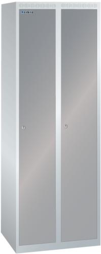 "longDescription": "LISTA Garderobenschrank, BxTxH: 600x500x1700mm, Anzahl Abteile: 2, Abteilbreite: 300mm, Ausstattung: je Abteil mit 1-flügeliger Vollblech-Tür einschlagend, Oberfläche mit Lochfeld zur zusätzlichen Belüftung (1 Abteil veschliessend), 1 Hutboden, 1 Kleiderstange mit je 3 verschiebbaren Kleiderhaken, 1 Handtuchhalter, ohne Unterbau, Schliessart: Verschlussvorrichtung, Farbe Gehäuse: Lichtgrau RAL 7035, Farbe Türen: Taubengrau NCS S 4502-B. Höchste Stabilität durch in Drehbolzen gelagerte, rechts angeschlagene Flügeltüren mit Verstärkungstasche für mehr Einbruchsicherheit. Durchdachte Belüftung mit Belüftungsschlitzen an Gehäusedeckel und -boden. Optimale Hygiene dank glatter Abteilböden ohne Aufkantung für eine gründliche Reinigung der Abteile. Schutz vor Verschmutzung und Korrosion durch zusätzlich zur Pulverbeschichtung verzinkten Unterbau mit Sockel gegen Verschmutzungen unter dem Schrank oder Füssen für Feuchträume<br>",