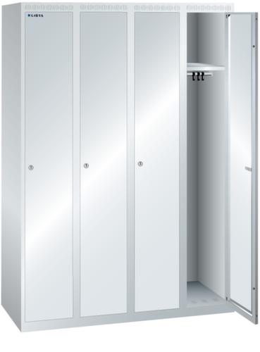"longDescription": "LISTA Garderobenschrank, BxTxH: 1200x500x1700mm, Anzahl Abteile: 4, Abteilbreite: 300mm, Ausstattung: je Abteil mit 1-flügeliger Vollblech-Tür einschlagend, Oberfläche mit Lochfeld zur zusätzlichen Belüftung (1 Abteil veschliessend), 1 Hutboden, 1 Kleiderstange mit je 3 verschiebbaren Kleiderhaken, 1 Handtuchhalter, ohne Unterbau, Schliessart: Verschlussvorrichtung, Farbe Gehäuse: Lichtgrau RAL 7035, Farbe Türen: Lichtgrau RAL 7035. Höchste Stabilität durch in Drehbolzen gelagerte, rechts angeschlagene Flügeltüren mit Verstärkungstasche für mehr Einbruchsicherheit. Durchdachte Belüftung mit Belüftungsschlitzen an Gehäusedeckel und -boden. Optimale Hygiene dank glatter Abteilböden ohne Aufkantung für eine gründliche Reinigung der Abteile. Schutz vor Verschmutzung und Korrosion durch zusätzlich zur Pulverbeschichtung verzinkten Unterbau mit Sockel gegen Verschmutzungen unter dem Schrank oder Füssen für Feuchträume<br>",