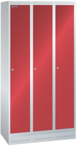 "longDescription": "LISTA Garderobenschrank, BxTxH: 900x500x1800mm, Anzahl Abteile: 3, Abteilbreite: 300mm, Ausstattung: je Abteil mit 1-flügeliger Vollblech-Tür einschlagend, Oberfläche glatt (1 Abteil veschliessend), 1 Hutboden, 1 Kleiderstange mit je 3 verschiebbaren Kleiderhaken, 1 Handtuchhalter, mit Sockel 100mm hoch, Schliessart: Zylinderschloss, Farbe Gehäuse: Lichtgrau RAL 7035, Farbe Türen: Rubinrot RAL 3003. Höchste Stabilität durch in Drehbolzen gelagerte, rechts angeschlagene Flügeltüren mit Verstärkungstasche für mehr Einbruchsicherheit. Durchdachte Belüftung mit Belüftungsschlitzen an Gehäusedeckel und -boden. Optimale Hygiene dank glatter Abteilböden ohne Aufkantung für eine gründliche Reinigung der Abteile. Schutz vor Verschmutzung und Korrosion durch zusätzlich zur Pulverbeschichtung verzinkten Unterbau mit Sockel gegen Verschmutzungen unter dem Schrank oder Füssen für Feuchträume<br>",