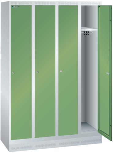 "longDescription": "LISTA Garderobenschrank, BxTxH: 1200x500x1800mm, Anzahl Abteile: 4, Abteilbreite: 300mm, Ausstattung: je Abteil mit 1-flügeliger Vollblech-Tür einschlagend, Oberfläche glatt (1 Abteil veschliessend), 1 Hutboden, 1 Kleiderstange mit je 3 verschiebbaren Kleiderhaken, 1 Handtuchhalter, mit Sockel 100mm hoch, Schliessart: Verschlussvorrichtung, Farbe Gehäuse: Lichtgrau RAL 7035, Farbe Türen: Resedagrün RAL 6011. Höchste Stabilität durch in Drehbolzen gelagerte, rechts angeschlagene Flügeltüren mit Verstärkungstasche für mehr Einbruchsicherheit. Durchdachte Belüftung mit Belüftungsschlitzen an Gehäusedeckel und -boden. Optimale Hygiene dank glatter Abteilböden ohne Aufkantung für eine gründliche Reinigung der Abteile. Schutz vor Verschmutzung und Korrosion durch zusätzlich zur Pulverbeschichtung verzinkten Unterbau mit Sockel gegen Verschmutzungen unter dem Schrank oder Füssen für Feuchträume<br>",