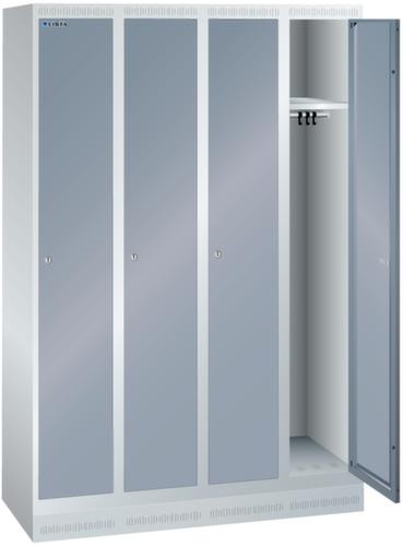 "longDescription": "LISTA Garderobenschrank, BxTxH: 1200x500x1800mm, Anzahl Abteile: 4, Abteilbreite: 300mm, Ausstattung: je Abteil mit 1-flügeliger Vollblech-Tür einschlagend, Oberfläche glatt (1 Abteil veschliessend), 1 Hutboden, 1 Kleiderstange mit je 3 verschiebbaren Kleiderhaken, 1 Handtuchhalter, mit Sockel 100mm hoch, Schliessart: Verschlussvorrichtung, Farbe Gehäuse: Lichtgrau RAL 7035, Farbe Türen: Grau metallic NCS S 6502-B. Höchste Stabilität durch in Drehbolzen gelagerte, rechts angeschlagene Flügeltüren mit Verstärkungstasche für mehr Einbruchsicherheit. Durchdachte Belüftung mit Belüftungsschlitzen an Gehäusedeckel und -boden. Optimale Hygiene dank glatter Abteilböden ohne Aufkantung für eine gründliche Reinigung der Abteile. Schutz vor Verschmutzung und Korrosion durch zusätzlich zur Pulverbeschichtung verzinkten Unterbau mit Sockel gegen Verschmutzungen unter dem Schrank oder Füssen für Feuchträume<br>",