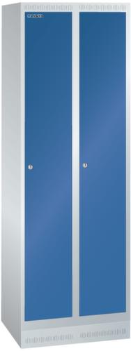 "longDescription": "LISTA Garderobenschrank, BxTxH: 600x500x1800mm, Anzahl Abteile: 2, Abteilbreite: 300mm, Ausstattung: je Abteil mit 1-flügeliger Vollblech-Tür einschlagend, Oberfläche mit Lochfeld zur zusätzlichen Belüftung (1 Abteil veschliessend), 1 Hutboden, 1 Kleiderstange mit je 3 verschiebbaren Kleiderhaken, 1 Handtuchhalter, mit Sockel 100mm hoch, Schliessart: Verschlussvorrichtung, Farbe Gehäuse: Lichtgrau RAL 7035, Farbe Türen: Enzianblau RAL 5010. Höchste Stabilität durch in Drehbolzen gelagerte, rechts angeschlagene Flügeltüren mit Verstärkungstasche für mehr Einbruchsicherheit. Durchdachte Belüftung mit Belüftungsschlitzen an Gehäusedeckel und -boden. Optimale Hygiene dank glatter Abteilböden ohne Aufkantung für eine gründliche Reinigung der Abteile. Schutz vor Verschmutzung und Korrosion durch zusätzlich zur Pulverbeschichtung verzinkten Unterbau mit Sockel gegen Verschmutzungen unter dem Schrank oder Füssen für Feuchträume<br>",