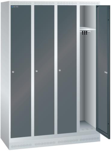 "longDescription": "LISTA Garderobenschrank, BxTxH: 1200x500x1800mm, Anzahl Abteile: 4, Abteilbreite: 300mm, Ausstattung: je Abteil mit 1-flügeliger Vollblech-Tür einschlagend, Oberfläche mit Lochfeld zur zusätzlichen Belüftung (1 Abteil veschliessend), 1 Hutboden, 1 Kleiderstange mit je 3 verschiebbaren Kleiderhaken, 1 Handtuchhalter, mit Sockel 100mm hoch, Schliessart: Verschlussvorrichtung, Farbe Gehäuse: Lichtgrau RAL 7035, Farbe Türen: Schwarz NCS S 9000-N. Höchste Stabilität durch in Drehbolzen gelagerte, rechts angeschlagene Flügeltüren mit Verstärkungstasche für mehr Einbruchsicherheit. Durchdachte Belüftung mit Belüftungsschlitzen an Gehäusedeckel und -boden. Optimale Hygiene dank glatter Abteilböden ohne Aufkantung für eine gründliche Reinigung der Abteile. Schutz vor Verschmutzung und Korrosion durch zusätzlich zur Pulverbeschichtung verzinkten Unterbau mit Sockel gegen Verschmutzungen unter dem Schrank oder Füssen für Feuchträume<br>",