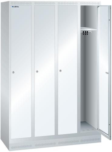 "longDescription": "LISTA Garderobenschrank, BxTxH: 1200x500x1800mm, Anzahl Abteile: 4, Abteilbreite: 300mm, Ausstattung: je Abteil mit 1-flügeliger Vollblech-Tür einschlagend, Oberfläche mit Lochfeld zur zusätzlichen Belüftung (1 Abteil veschliessend), 1 Hutboden, 1 Kleiderstange mit je 3 verschiebbaren Kleiderhaken, 1 Handtuchhalter, mit Sockel 100mm hoch, Schliessart: Verschlussvorrichtung, Farbe Gehäuse: Lichtgrau RAL 7035, Farbe Türen: Reinweiss RAL 9010. Höchste Stabilität durch in Drehbolzen gelagerte, rechts angeschlagene Flügeltüren mit Verstärkungstasche für mehr Einbruchsicherheit. Durchdachte Belüftung mit Belüftungsschlitzen an Gehäusedeckel und -boden. Optimale Hygiene dank glatter Abteilböden ohne Aufkantung für eine gründliche Reinigung der Abteile. Schutz vor Verschmutzung und Korrosion durch zusätzlich zur Pulverbeschichtung verzinkten Unterbau mit Sockel gegen Verschmutzungen unter dem Schrank oder Füssen für Feuchträume<br>",