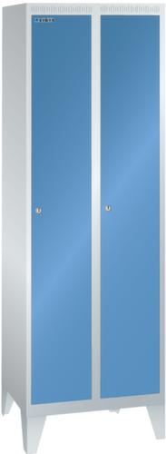 "longDescription": "LISTA Garderobenschrank, BxTxH: 600x500x1850mm, Anzahl Abteile: 2, Abteilbreite: 300mm, Ausstattung: je Abteil mit 1-flügeliger Vollblech-Tür einschlagend, Oberfläche glatt (1 Abteil veschliessend), 1 Hutboden, 1 Kleiderstange mit je 3 verschiebbaren Kleiderhaken, 1 Handtuchhalter, mit Füssen 150mm hoch, Schliessart: Zylinderschloss, Farbe Gehäuse: Lichtgrau RAL 7035, Farbe Türen: Capriblau RAL 5019. Höchste Stabilität durch in Drehbolzen gelagerte, rechts angeschlagene Flügeltüren mit Verstärkungstasche für mehr Einbruchsicherheit. Durchdachte Belüftung mit Belüftungsschlitzen an Gehäusedeckel und -boden. Optimale Hygiene dank glatter Abteilböden ohne Aufkantung für eine gründliche Reinigung der Abteile. Schutz vor Verschmutzung und Korrosion durch zusätzlich zur Pulverbeschichtung verzinkten Unterbau mit Sockel gegen Verschmutzungen unter dem Schrank oder Füssen für Feuchträume<br>",