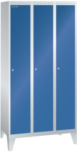 "longDescription": "LISTA Garderobenschrank, BxTxH: 900x500x1850mm, Anzahl Abteile: 3, Abteilbreite: 300mm, Ausstattung: je Abteil mit 1-flügeliger Vollblech-Tür einschlagend, Oberfläche mit Lochfeld zur zusätzlichen Belüftung (1 Abteil veschliessend), 1 Hutboden, 1 Kleiderstange mit je 3 verschiebbaren Kleiderhaken, 1 Handtuchhalter, mit Füssen 150mm hoch, Schliessart: Zylinderschloss, Farbe Gehäuse: Lichtgrau RAL 7035, Farbe Türen: Enzianblau RAL 5010. Höchste Stabilität durch in Drehbolzen gelagerte, rechts angeschlagene Flügeltüren mit Verstärkungstasche für mehr Einbruchsicherheit. Durchdachte Belüftung mit Belüftungsschlitzen an Gehäusedeckel und -boden. Optimale Hygiene dank glatter Abteilböden ohne Aufkantung für eine gründliche Reinigung der Abteile. Schutz vor Verschmutzung und Korrosion durch zusätzlich zur Pulverbeschichtung verzinkten Unterbau mit Sockel gegen Verschmutzungen unter dem Schrank oder Füssen für Feuchträume<br>",