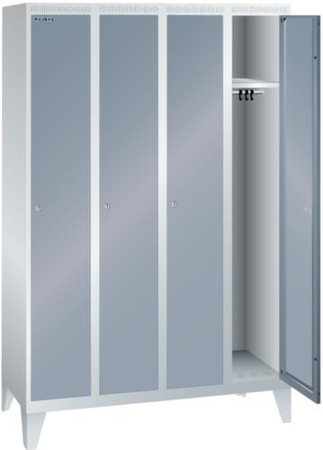 "longDescription": "LISTA Garderobenschrank, BxTxH: 1200x500x1850mm, Anzahl Abteile: 4, Abteilbreite: 300mm, Ausstattung: je Abteil mit 1-flügeliger Vollblech-Tür einschlagend, Oberfläche mit Lochfeld zur zusätzlichen Belüftung (1 Abteil veschliessend), 1 Hutboden, 1 Kleiderstange mit je 3 verschiebbaren Kleiderhaken, 1 Handtuchhalter, mit Füssen 150mm hoch, Schliessart: Zylinderschloss, Farbe Gehäuse: Lichtgrau RAL 7035, Farbe Türen: Grau metallic NCS S 6502-B. Höchste Stabilität durch in Drehbolzen gelagerte, rechts angeschlagene Flügeltüren mit Verstärkungstasche für mehr Einbruchsicherheit. Durchdachte Belüftung mit Belüftungsschlitzen an Gehäusedeckel und -boden. Optimale Hygiene dank glatter Abteilböden ohne Aufkantung für eine gründliche Reinigung der Abteile. Schutz vor Verschmutzung und Korrosion durch zusätzlich zur Pulverbeschichtung verzinkten Unterbau mit Sockel gegen Verschmutzungen unter dem Schrank oder Füssen für Feuchträume<br>",