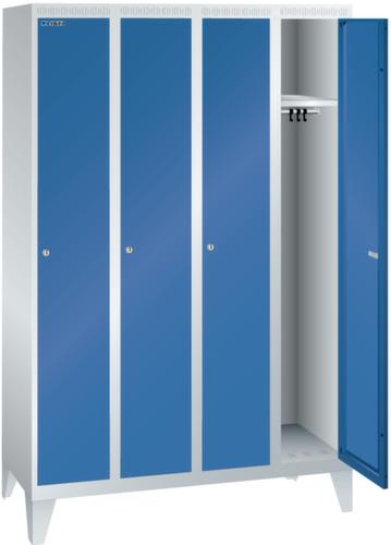 "longDescription": "LISTA Garderobenschrank, BxTxH: 1200x500x1850mm, Anzahl Abteile: 4, Abteilbreite: 300mm, Ausstattung: je Abteil mit 1-flügeliger Vollblech-Tür einschlagend, Oberfläche mit Lochfeld zur zusätzlichen Belüftung (1 Abteil veschliessend), 1 Hutboden, 1 Kleiderstange mit je 3 verschiebbaren Kleiderhaken, 1 Handtuchhalter, mit Füssen 150mm hoch, Schliessart: Zylinderschloss, Farbe Gehäuse: Lichtgrau RAL 7035, Farbe Türen: Enzianblau RAL 5010. Höchste Stabilität durch in Drehbolzen gelagerte, rechts angeschlagene Flügeltüren mit Verstärkungstasche für mehr Einbruchsicherheit. Durchdachte Belüftung mit Belüftungsschlitzen an Gehäusedeckel und -boden. Optimale Hygiene dank glatter Abteilböden ohne Aufkantung für eine gründliche Reinigung der Abteile. Schutz vor Verschmutzung und Korrosion durch zusätzlich zur Pulverbeschichtung verzinkten Unterbau mit Sockel gegen Verschmutzungen unter dem Schrank oder Füssen für Feuchträume<br>",