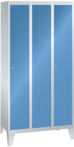 "longDescription": "LISTA Garderobenschrank, BxTxH: 900x500x1850mm, Anzahl Abteile: 3, Abteilbreite: 300mm, Ausstattung: je Abteil mit 1-flügeliger Vollblech-Tür einschlagend, Oberfläche mit Lochfeld zur zusätzlichen Belüftung (1 Abteil veschliessend), 1 Hutboden, 1 Kleiderstange mit je 3 verschiebbaren Kleiderhaken, 1 Handtuchhalter, mit Füssen 150mm hoch, Schliessart: Verschlussvorrichtung, Farbe Gehäuse: Lichtgrau RAL 7035, Farbe Türen: Capriblau RAL 5019. Höchste Stabilität durch in Drehbolzen gelagerte, rechts angeschlagene Flügeltüren mit Verstärkungstasche für mehr Einbruchsicherheit. Durchdachte Belüftung mit Belüftungsschlitzen an Gehäusedeckel und -boden. Optimale Hygiene dank glatter Abteilböden ohne Aufkantung für eine gründliche Reinigung der Abteile. Schutz vor Verschmutzung und Korrosion durch zusätzlich zur Pulverbeschichtung verzinkten Unterbau mit Sockel gegen Verschmutzungen unter dem Schrank oder Füssen für Feuchträume<br>",
