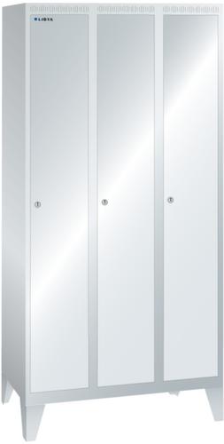 "longDescription": "LISTA Garderobenschrank, BxTxH: 900x500x1850mm, Anzahl Abteile: 3, Abteilbreite: 300mm, Ausstattung: je Abteil mit 1-flügeliger Vollblech-Tür einschlagend, Oberfläche mit Lochfeld zur zusätzlichen Belüftung (1 Abteil veschliessend), 1 Hutboden, 1 Kleiderstange mit je 3 verschiebbaren Kleiderhaken, 1 Handtuchhalter, mit Füssen 150mm hoch, Schliessart: Verschlussvorrichtung, Farbe Gehäuse: Lichtgrau RAL 7035, Farbe Türen: Reinweiss RAL 9010. Höchste Stabilität durch in Drehbolzen gelagerte, rechts angeschlagene Flügeltüren mit Verstärkungstasche für mehr Einbruchsicherheit. Durchdachte Belüftung mit Belüftungsschlitzen an Gehäusedeckel und -boden. Optimale Hygiene dank glatter Abteilböden ohne Aufkantung für eine gründliche Reinigung der Abteile. Schutz vor Verschmutzung und Korrosion durch zusätzlich zur Pulverbeschichtung verzinkten Unterbau mit Sockel gegen Verschmutzungen unter dem Schrank oder Füssen für Feuchträume<br>",