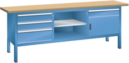 "longDescription": "LISTA Kompaktwerkbank, BxTxH: 2000x700x840mm, Material: Multiplex, 40mm stark, Max. Belastung: 1500kg, Anzahl Schubladen: 4, Anzahl Fronthöhen (Tragkraft): 3x150mm (75kg), 1x200mm (75kg), Schubladen-Nutzfläche BxT: 500x600mm, Fächer mit Türen: 1x350mm, Anzahl Fachböden: 3 (50kg), Schliessart: Key Lock, Standard-Schliessung mit Wechselzylinder inkl. 2 Schlüsseln mit Schlüsselnummer, Farbe Gehäuse: Capriblau RAL 5019, Farbe Schubladen/Türen: Capriblau RAL 5019. Höchste Stabilität: Gehäuse bis 1,5 t belastbar, alle Verbindungen verschweisst. Platzsparende und übersichtliche Lagerung in variablen Unterbauten mit leichtgängigen Schubladen mit 75 kg Tragkraft mit Vollauszug und vielfältigem Einteilungsmaterial. Sichere Verschliessbarkeit mit Schliesssystem Key Lock zur gleichzeitigen Sicherung aller Schubladen und Türen vor ungewolltem Zugriff. Hohe Ausführungsvielfalt dank verschiedener Komponenten, Unterbauten, Materialien und Oberflächen. Höchster Bedienkomfort und Ergonomie durch höhenverstellbare Werkbankfüsse für ergonomisch richtige Arbeitshöhen und Beinfreiheit bei sitzenden Tätigkeiten sowie unser modulares Aufbauten-System. Jederzeit anpassbar an neue Arbeitsumgebungen durch den flexiblen Ein- und Umbau sämtlicher Komponenten im Baukastensystem<br>",
