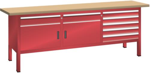 "longDescription": "LISTA Kompaktwerkbank, BxTxH: 2000x700x850mm, Material: Buche, 50mm stark, Max. Belastung: 1500kg, Anzahl Schubladen: 7, Anzahl Fronthöhen (Tragkraft): 5x100mm (75kg), 2x150mm (75kg), Schubladen-Nutzfläche BxT: 500x600mm, Fächer mit Türen: 2x350mm, Anzahl Fachböden: 2 (50kg), Schliessart: Key Lock, Standard-Schliessung mit Wechselzylinder inkl. 2 Schlüsseln mit Schlüsselnummer, Farbe Gehäuse: Rubinrot RAL 3003, Farbe Schubladen/Türen: Rubinrot RAL 3003. Höchste Stabilität: Gehäuse bis 1,5 t belastbar, alle Verbindungen verschweisst. Platzsparende und übersichtliche Lagerung in variablen Unterbauten mit leichtgängigen Schubladen mit 75 kg Tragkraft mit Vollauszug und vielfältigem Einteilungsmaterial. Sichere Verschliessbarkeit mit Schliesssystem Key Lock zur gleichzeitigen Sicherung aller Schubladen und Türen vor ungewolltem Zugriff. Hohe Ausführungsvielfalt dank verschiedener Komponenten, Unterbauten, Materialien und Oberflächen. Höchster Bedienkomfort und Ergonomie durch höhenverstellbare Werkbankfüsse für ergonomisch richtige Arbeitshöhen und Beinfreiheit bei sitzenden Tätigkeiten sowie unser modulares Aufbauten-System. Jederzeit anpassbar an neue Arbeitsumgebungen durch den flexiblen Ein- und Umbau sämtlicher Komponenten im Baukastensystem<br>",