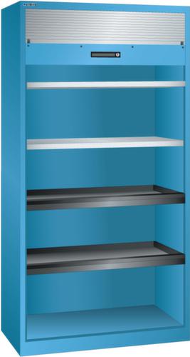 "longDescription": "LISTA Rollladenschrank, BxTxH: 1000x580x1950mm, Anzahl Verstellböden: 2 (60kg), 30mm stark, verzinkt, Anzahl Auszugböden: 2 (50kg), Schliessart: Schiebegriff-Zylinderschloss mit Wechselyzlinder inkl. 2 Schlüsseln mit Schlüsselnummer, Farbe Gehäuse/Schliessleiste: Lichtblau RAL 5012, Farbe Rollladen: aus PVC, ähnlich Lichtgrau RAL 7035, Farbe Auszugböden: Anthrazitgrau RAL 7016. Höchste Stabilität durch eine Gehäusetragkraft bis 500 kg. Sichere Verschliessbarkeit dank leichtgängigem Rollladen mit bedienerfreundlichem Schiebegriff und integriertem Zylinderschloss mit Wechselzylinder (weitere Schliesssysteme auf Anfrage). Höchster Bedienkomfort: Rollladen bleibt ohne Arretierung in jeder Höhe stehen. Allgemeine Vorteile der LISTA Schranksysteme<br>",